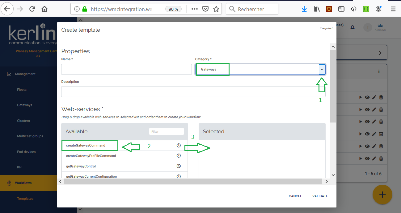 Select the category: Gateways, select the CreateGatewayCommand method in the list and drag and drop it in the Selected window on the righ side of the screen:
