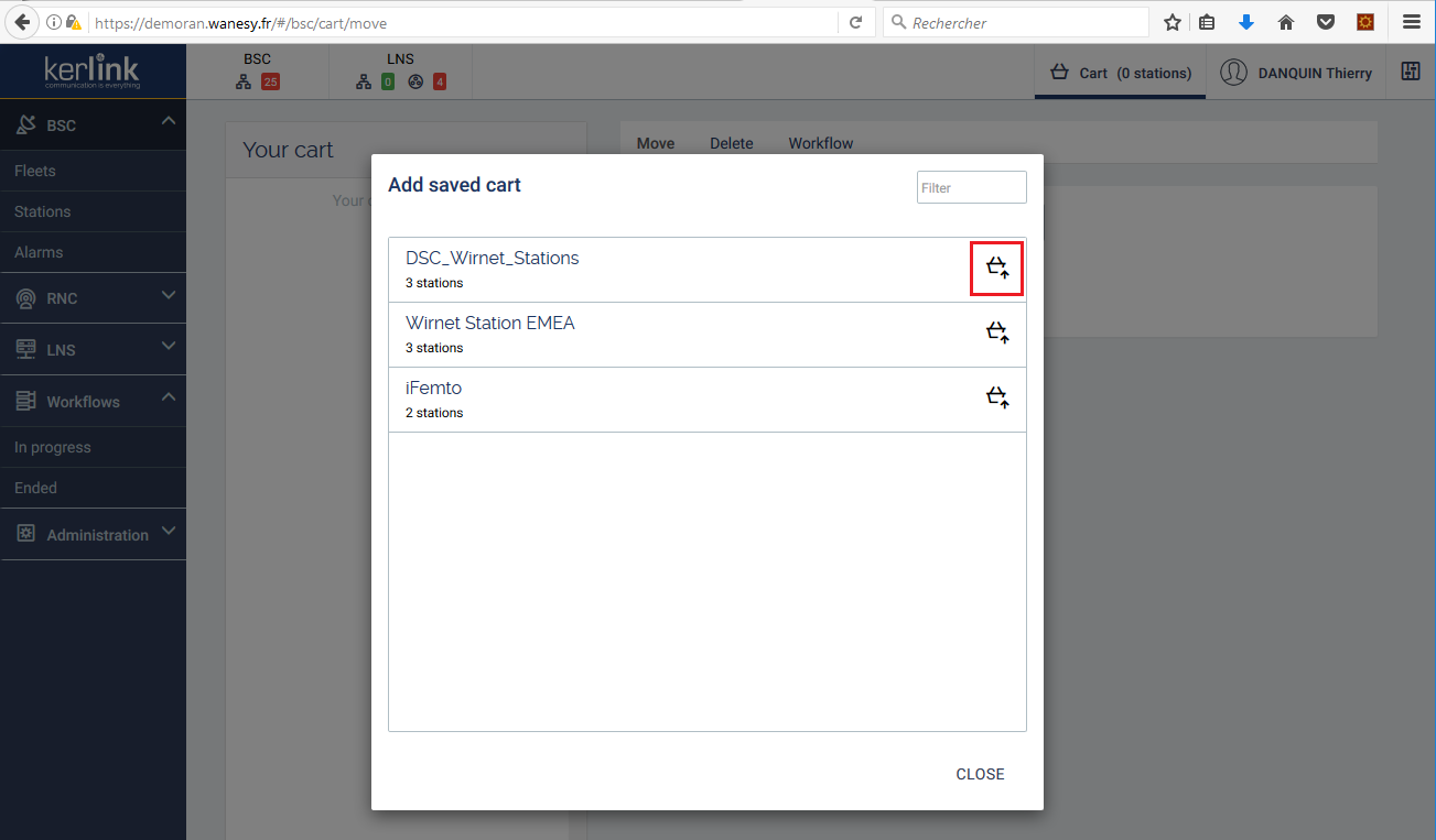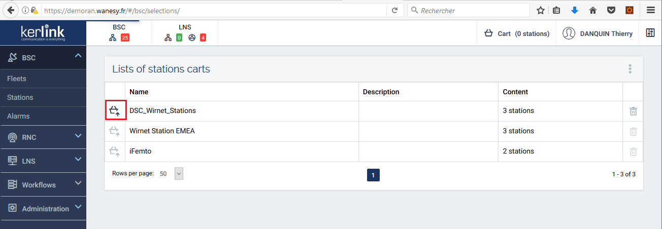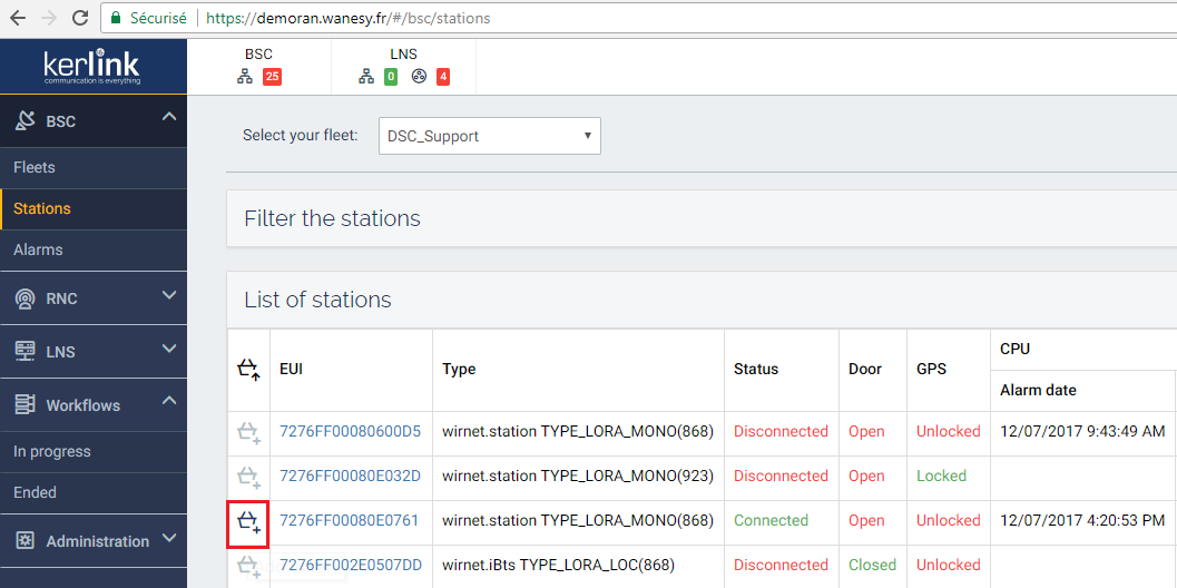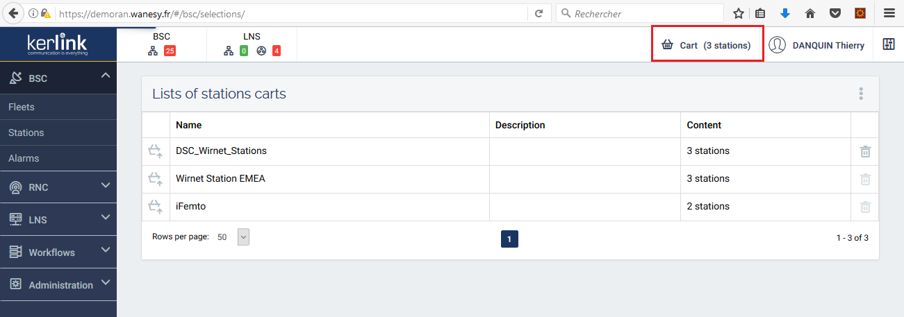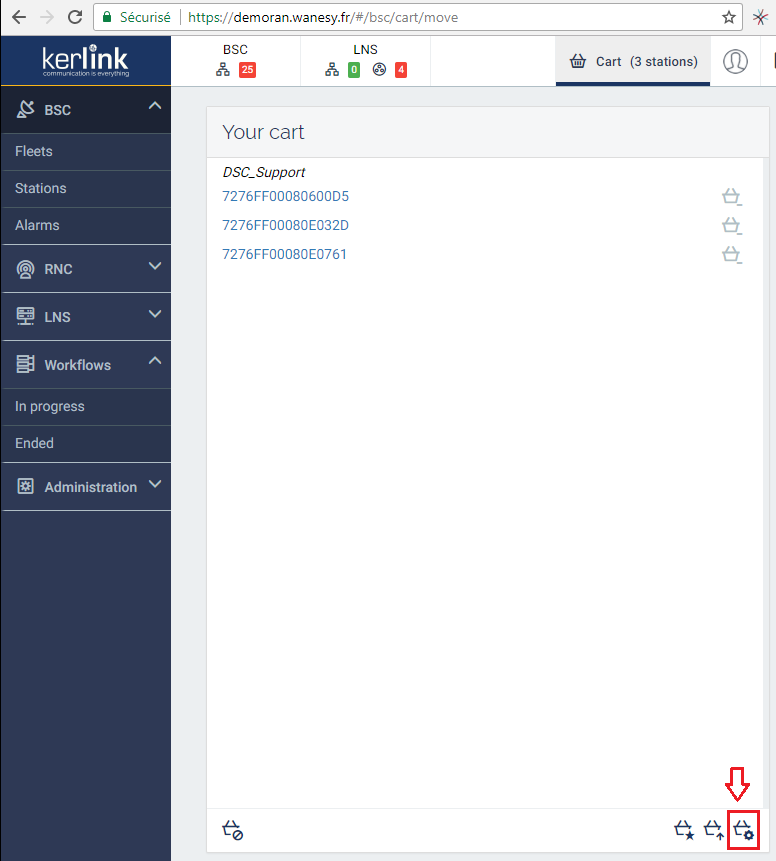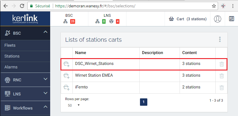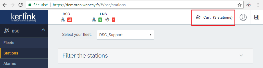 In BSCC menu, click on “Stations” and select the stations you want to add in your cart by clicking on the “Cart button” at the left side of the station's EUI:
