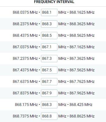 The network channels can be freely attributed by the network operator. However the three following default channels must be implemented in every end-device. Those channels are the minimum set that all network gateways should always be listening on.
