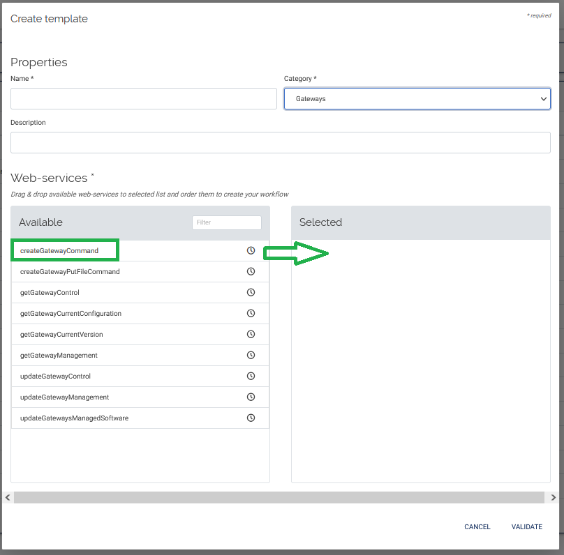 Give a name to your template ex “createGatewayCommand” and give a description. Then drag and drop the web service “createGatewayCommand” to the “Selected” area. Finally select the “VALIDATE” button to confirm the template creation.