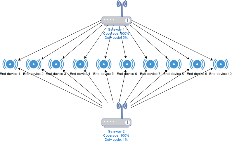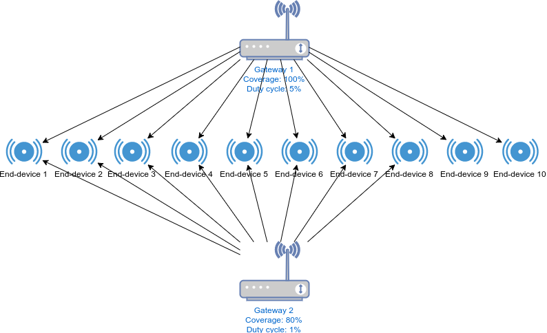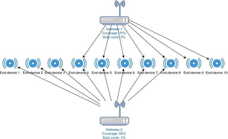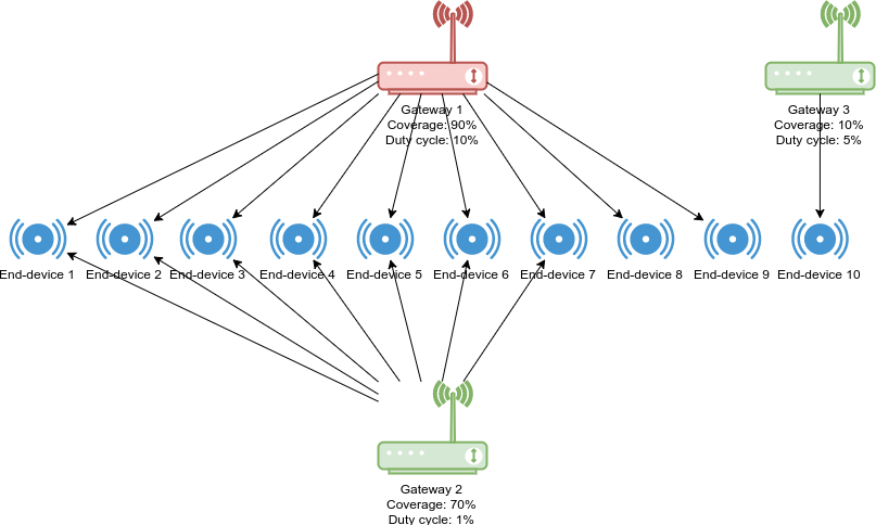 In all cases, a gateway cannot be selected if its duty cycle is over the maximum limit or if downlink is not allowed by its owner.