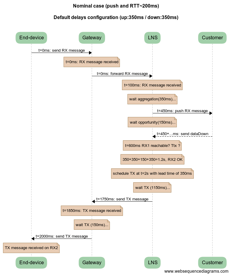 This is the nominal case. The LNS will always target the RX2. The configured delays on the dashboard are the default values (350ms).