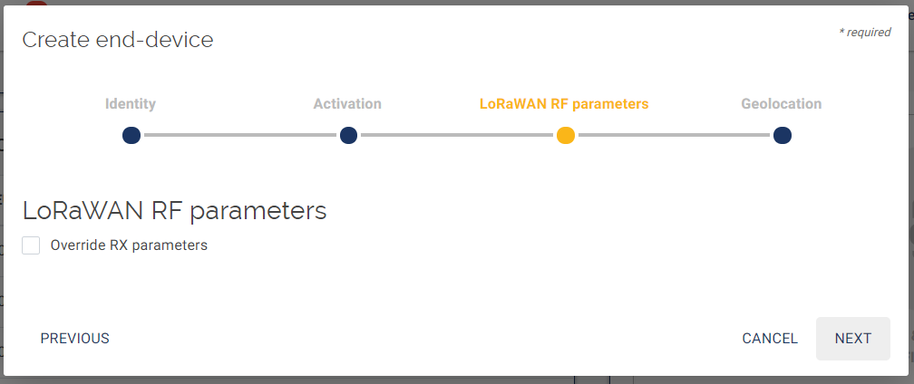 The following page invites you to define RF parameters.