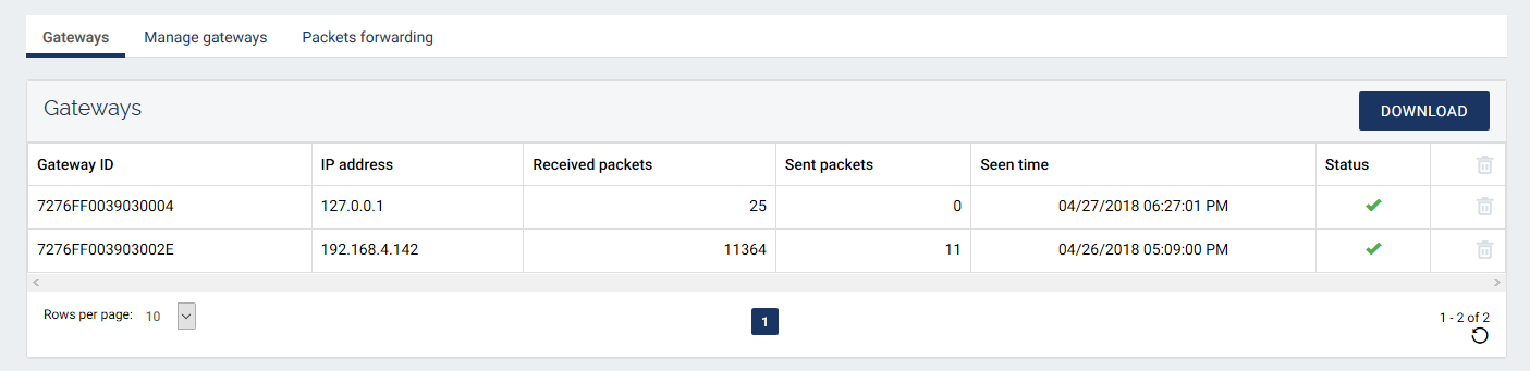 The statistics can be downloaded in .csv format. The status field indicates if a gateway has been seen at least once. If the connection to a gateway is lost its status field is not updated.