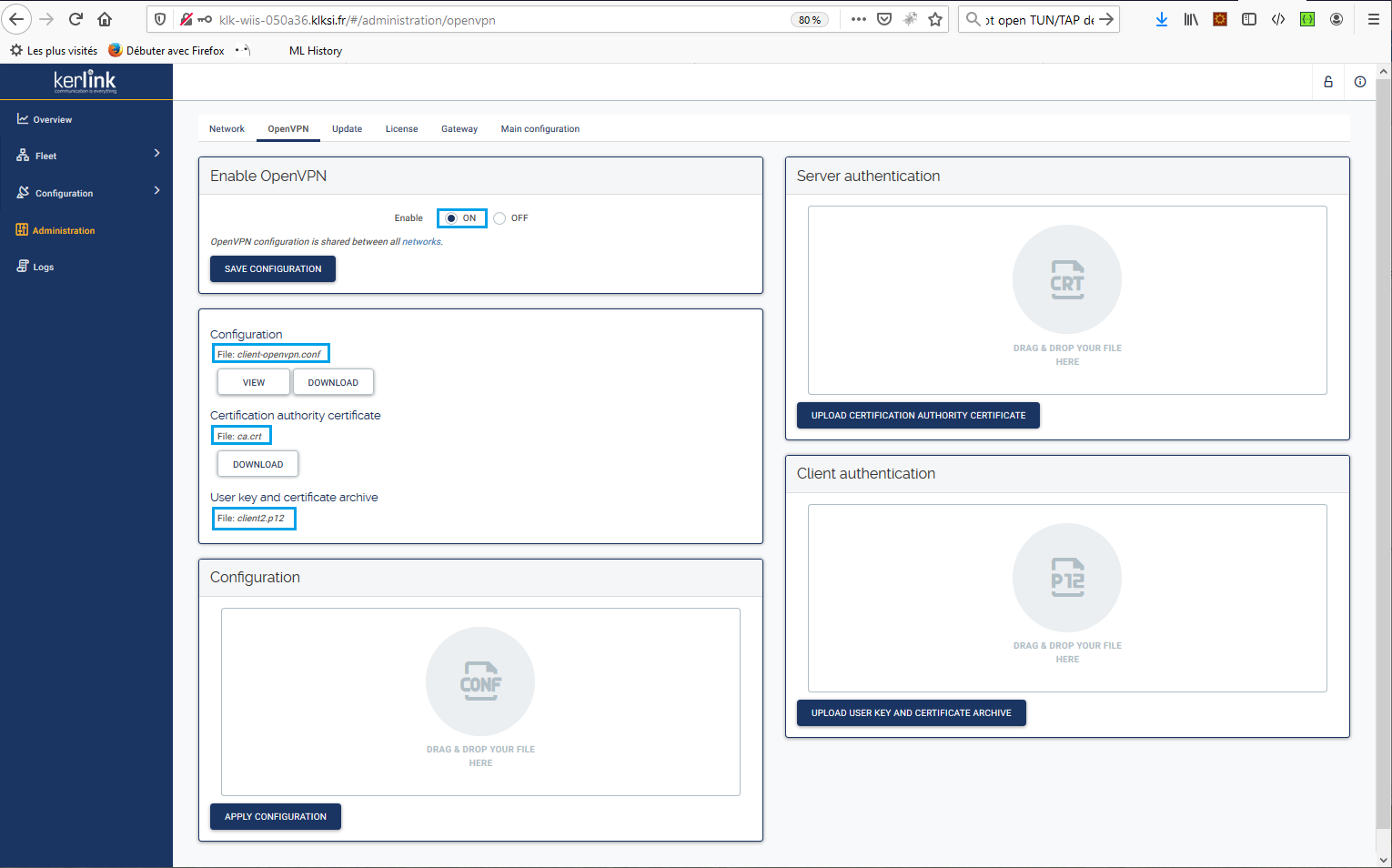 Select the “Enable” button from the Administration > OpenVPN menu option and drag and drop the following files :