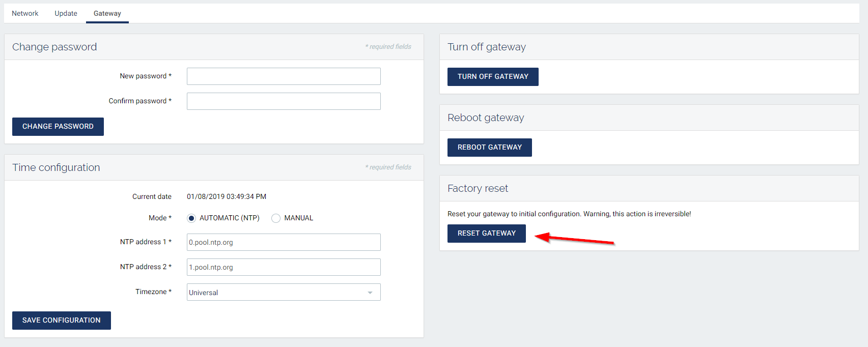 To factory reset the gateway, you can use the stock restore feature. A “stock restore” will factory reset the gateway. All data will be lost.