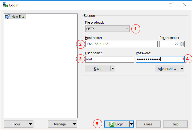 Start an SFTP client (typically WinSCP on Windows) using the gateway’s name or IP address.