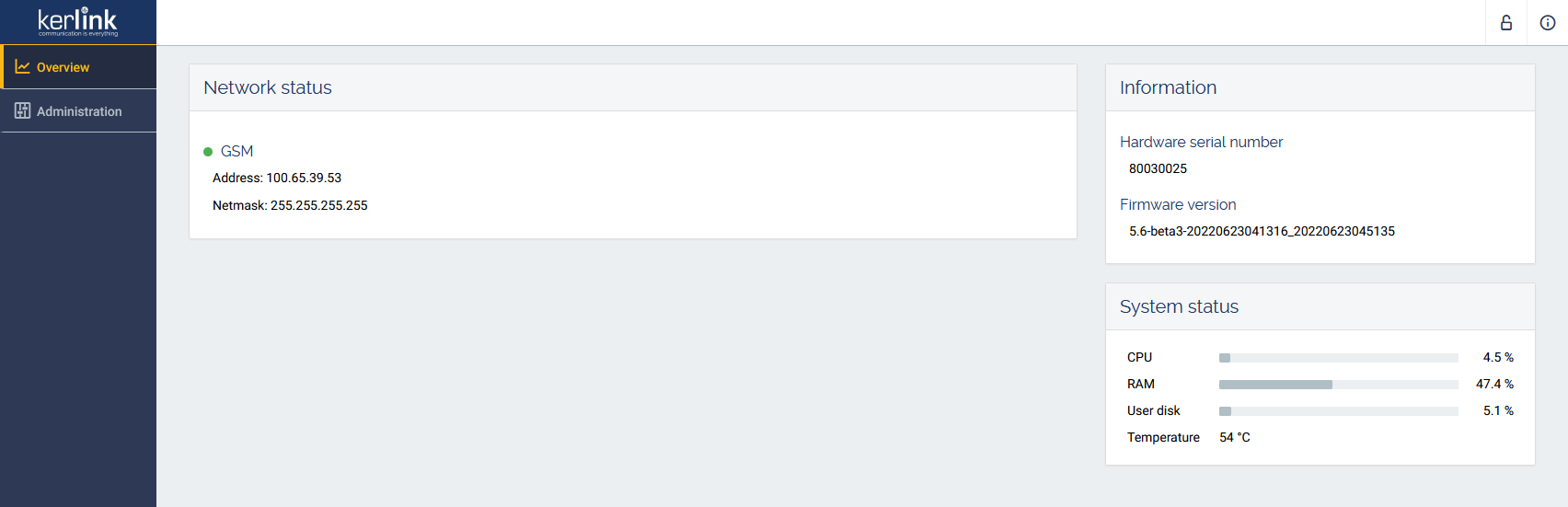 The overview menu provides the network connectivity status as well as the firmware version, the hardware serial number, and the system status.