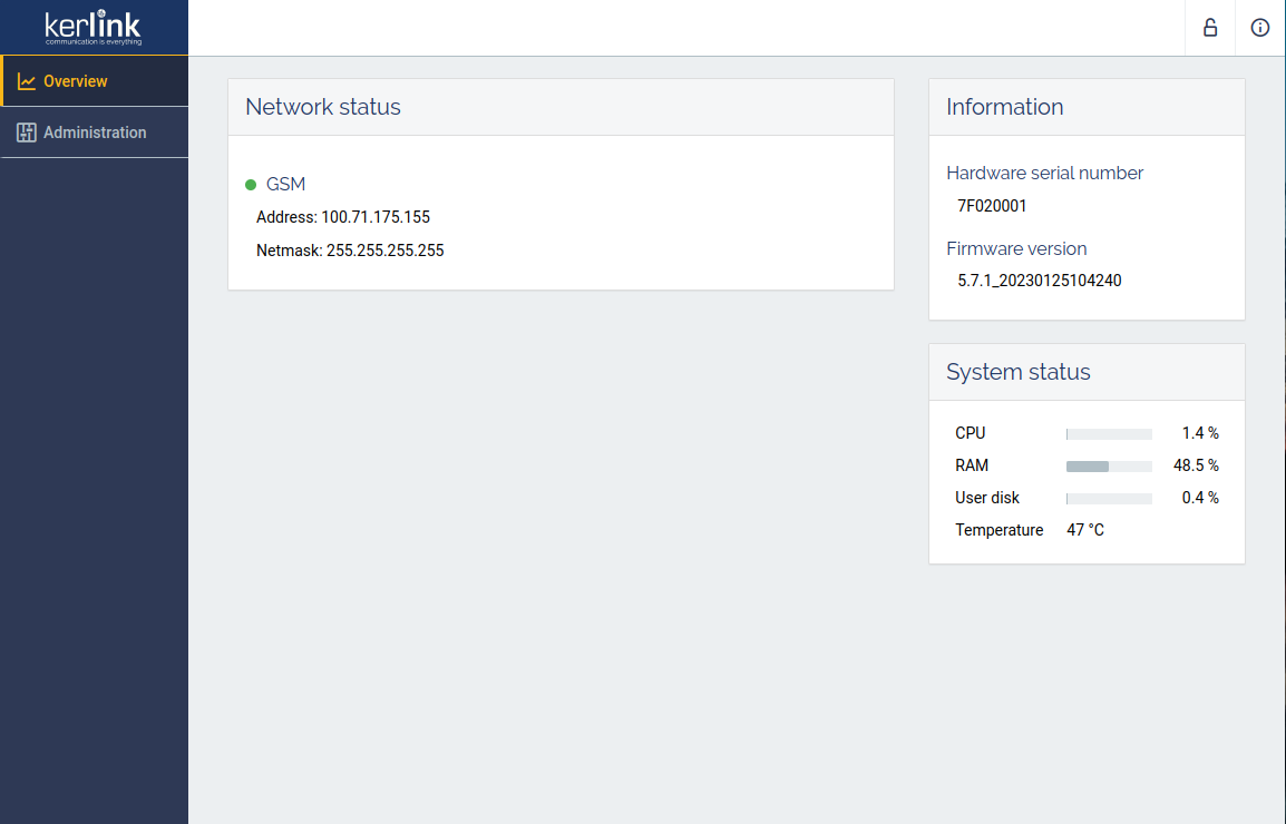 The overview menu provides the network connectivity status as well as the firmware version, the hardware serial number, and the system status.